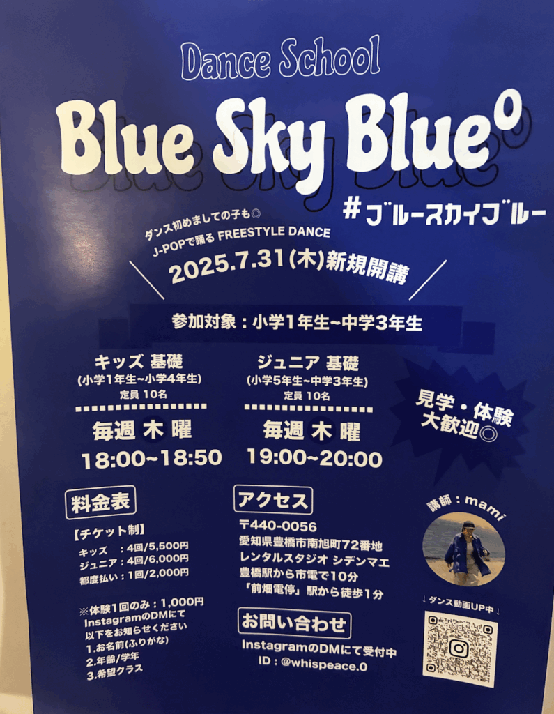 Blue Sky Blue°(ブルースカイブルー)は、愛知県豊橋市を拠点に活動するダンススクール/チームです。特に「邦楽で踊るFreestyle」を大きな特徴としており、「誰かのために表現するダンス」を理念に掲げています。