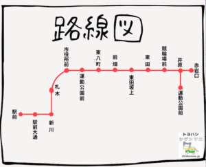 駅前 駅前大通 新川 札木 市役所前 豊橋公園前 東八町 前畑 東田坂上 東田 競輪場前 井原 赤岩口 運動公園前