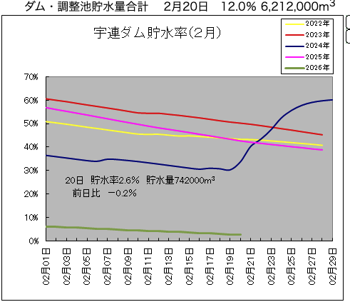 宇連ダムが干上がると、セットで大島ダムなどの周辺ダムから必死に補給を行う「綱渡り」の運用が始まるので、関係者の方々は今かなりピリピリしている時期かもしれませんね。